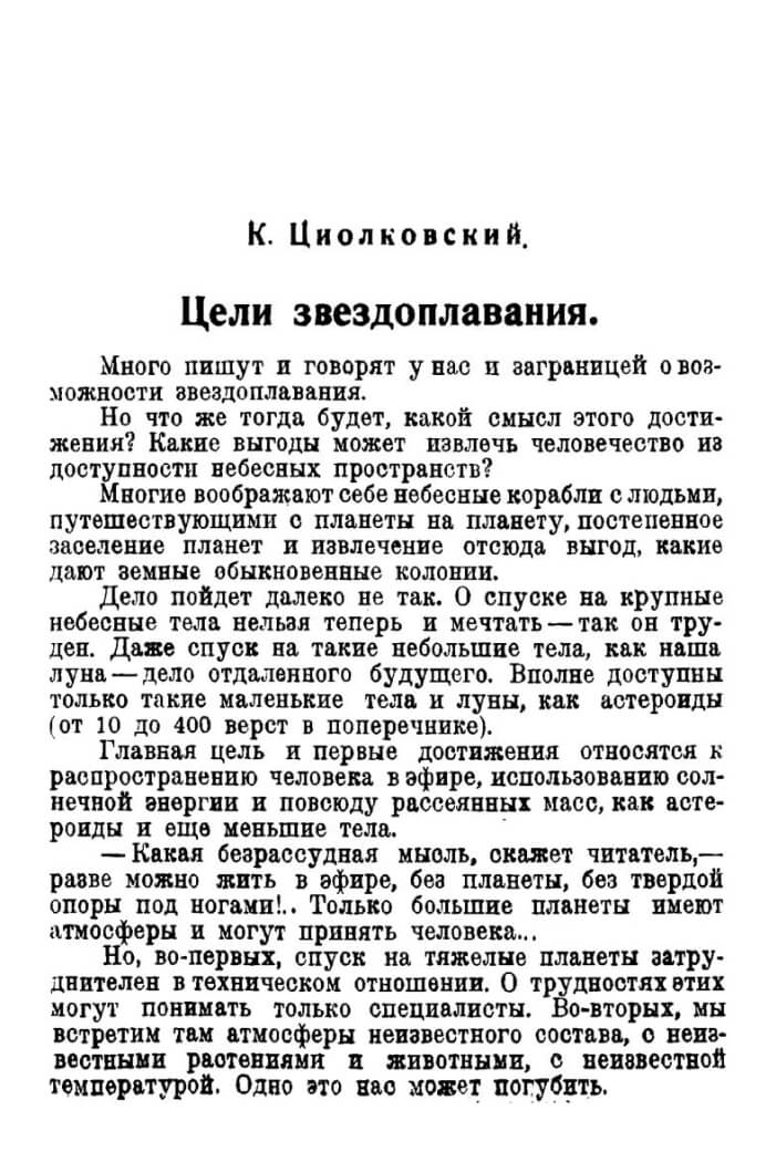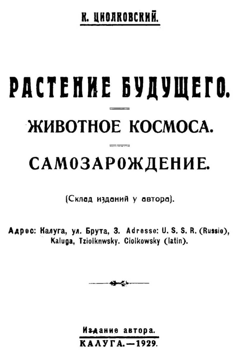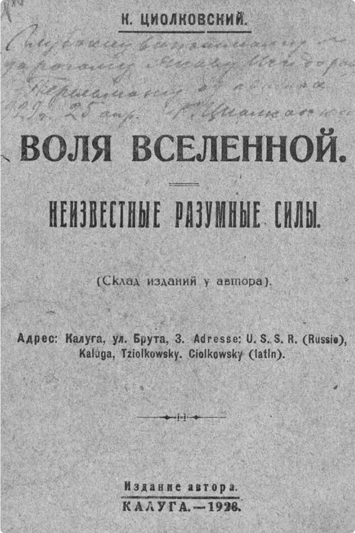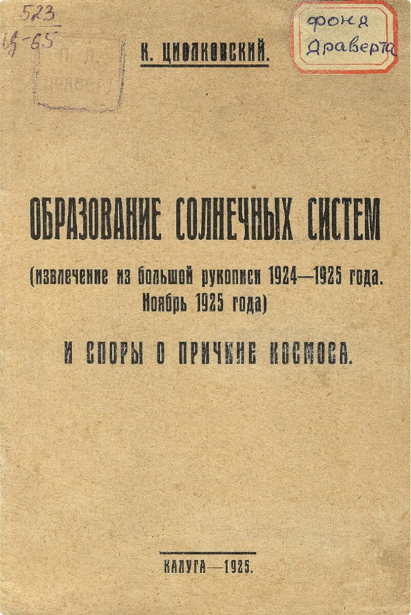 Издана автором в 1929 г. в Калуге. Извлечение из большой рукописи 1924−1925 гг. В книге две работы: «Образование солнечных систем» («Все мои вычисления произведены совершенно самостоятельно») и «Споры о причине космоса», о последней у автора говорится: «Люди нередко называют её [причину] богом».
