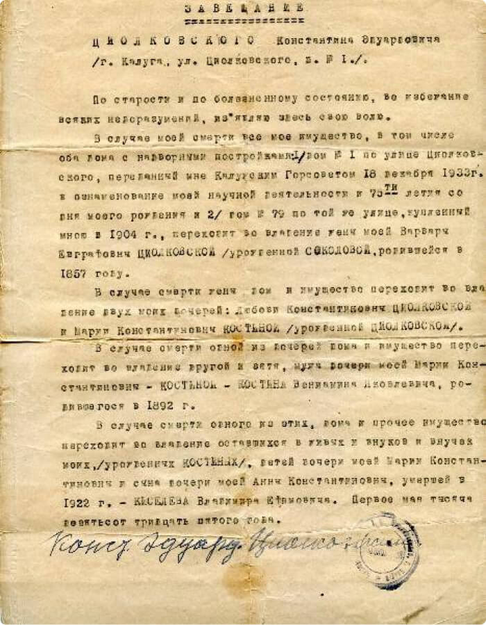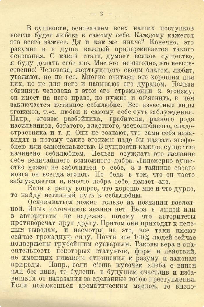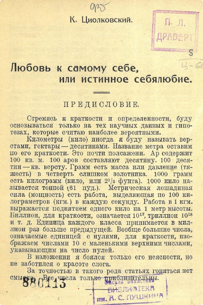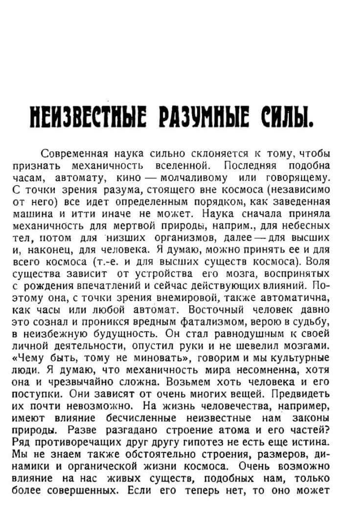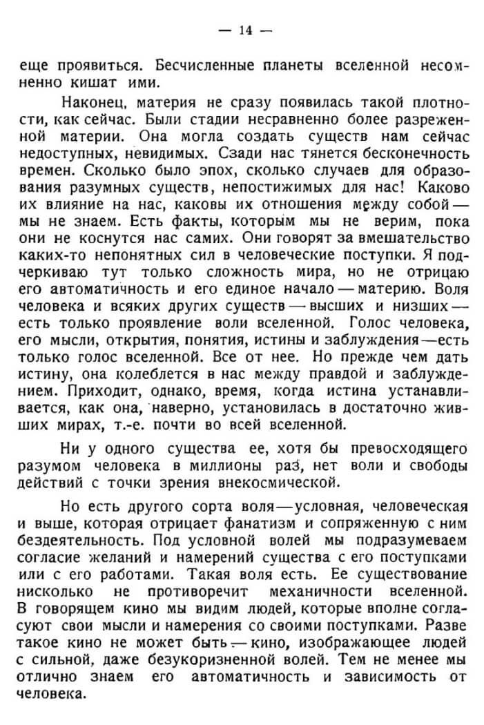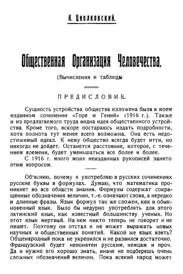 Издана автором в 1925 г. в Калуге. Конспект или резюме предваряет предисловие, адресованное читателям: «В мои годы умирают и я боюсь, что вы уйдёте из этой жизни с горестью в сердце, не узнав от меня (из чистого источника знания), что вас ожидает непрерывная радость… Моя проповедь, в моих глазах, даже не мечта, а строго математический вывод из точного знания».