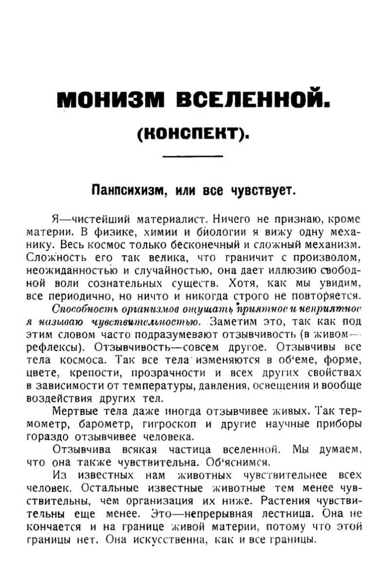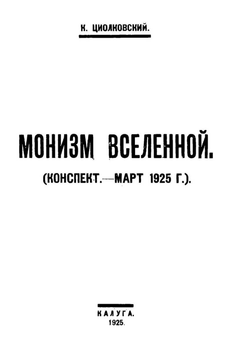 Издана автором в 1929 г. в Калуге. С примечанием «Склад изданий у автора». В конце — отзыв о «Монизме вселенной» писателя-астронома NN.